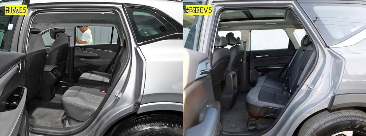 而且,起亚EV5的后排座椅靠背支持最大33度可调,后排乘员的腿部空间在足够用的前提下,后排座椅靠背还支持较大范围的调节,舒适性无疑更好,相反别克E5的后排座椅靠背不支持调节,在这样的情况下,你会怎么选呢?值得一说的是,Land版起亚EV5还独有可开启的全景天窗,后排乘员的空间通透性也会更好,而先锋版别克E5没有天窗。