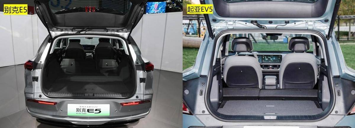 从后排乘员的腿部空间上来看,别克E5优于起亚EV5无需反驳,但起亚EV5独有67L的前备箱,并且513L的初始后备箱空间也强于别克E5的502L后备箱空间,后排座椅放倒后的后备箱空间为1718L,也大于别克E5的1658L最大后备箱拓展空间。