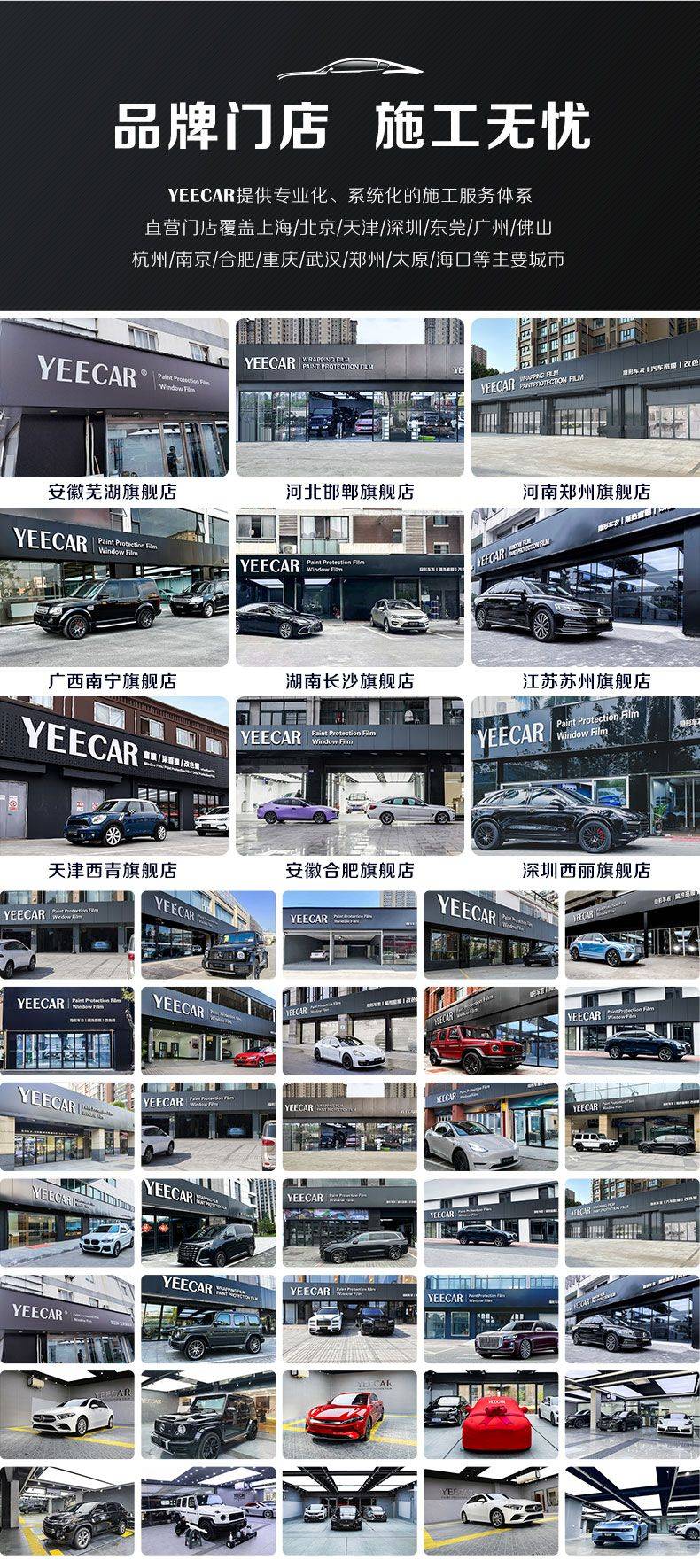 售后保障是选购改色膜的重要考量,避免后期维修无门。YEECAR艺卡在全国拥有超过60家直营门店和3000多家授权门店,全部提供售后服务。车主可以随时利用艺卡的广泛门店网络,无论出差、旅行或是回家,始终享受高端贴膜服务,无忧售后。