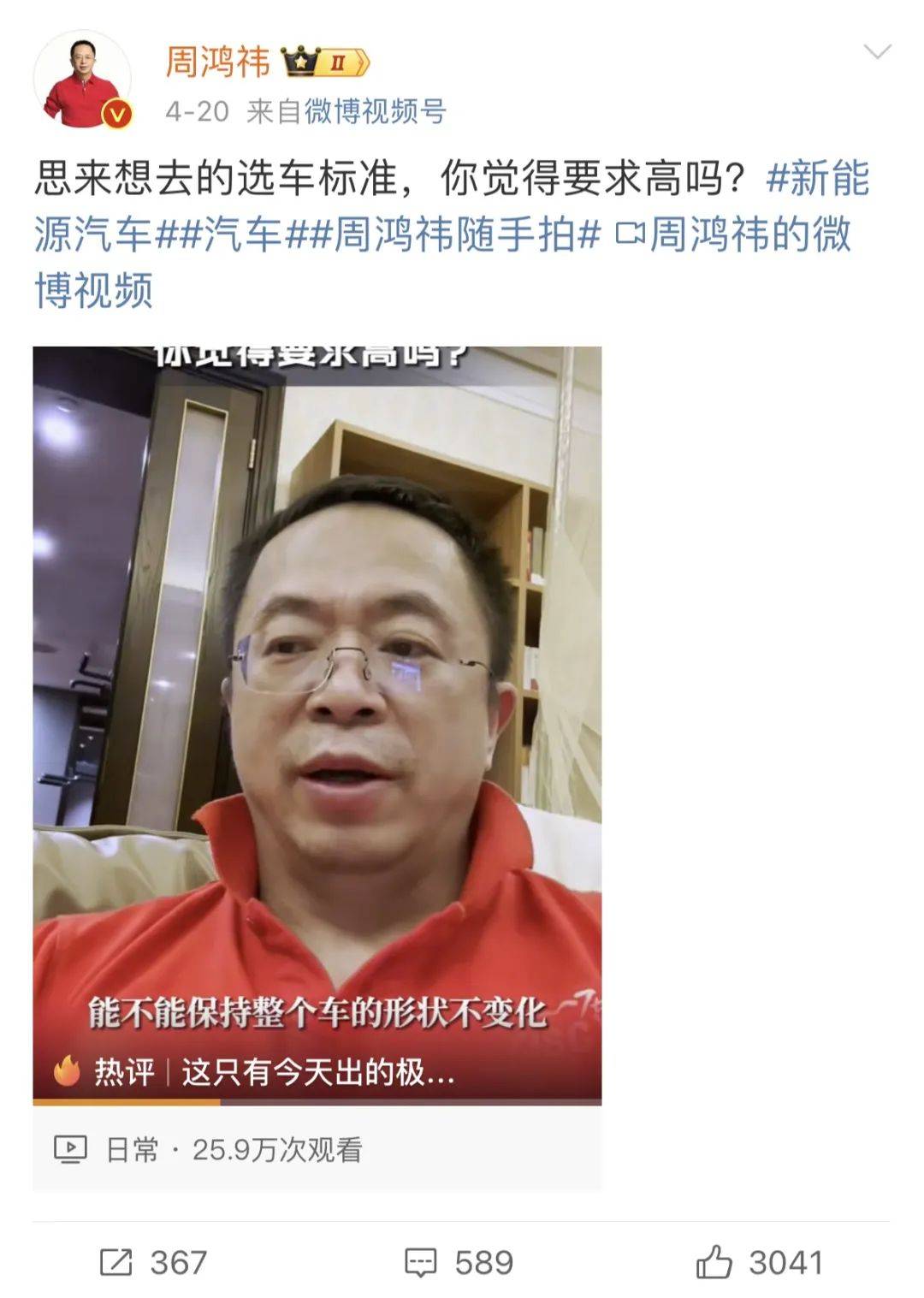4月20日,周鸿祎发视频公布了选车标准。因为没有驾照,他只能从乘坐角度出发,这6个标准是: