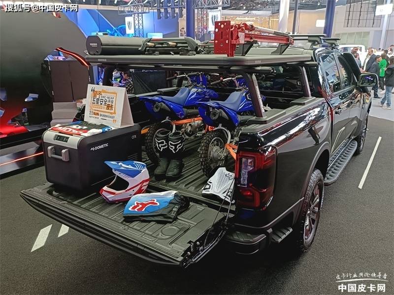 车后部,黑化后,全新一代福特游骑侠Ranger探迹版在车展上对“后斗是皮卡的灵魂”这一福特汽车基于对皮卡深刻理解提出的“金句”进行了场景化展示,装入了电动机车和车载冰箱等物品。