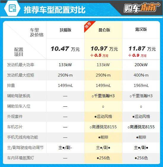 通过对比配置不难发现,推荐车型为搭载1.5T发动机的顶配版本,与低一级的扶摇版相比,增加了运动风格外观套件、前排手机无线充电、副驾驶座电动调节以及256色车内氛围灯等配置,且差价仅为5000元,物有所值。同时,其还提供了智能科技包可以选装,包含千里浩瀚H3辅助驾驶系统、高通骁龙8155车机芯片以及5年HNOA高速领航驾驶辅助软件权益等内容,这是扶摇版所不具备的。
