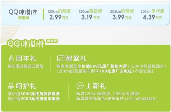 新车主要在配置和配色方面进行了调整,QQ冰淇淋青春版,除了120km奶昔版之外,全系可选菁纯绿车色以及全系标配倒车影像、9英寸大屏;小蚂蚁青春版新增加仑黑内饰+绿色缝线,带来焕然一新的视觉感受。同时车机还增加了新的UI主题,以及6项舒适性配置升级。