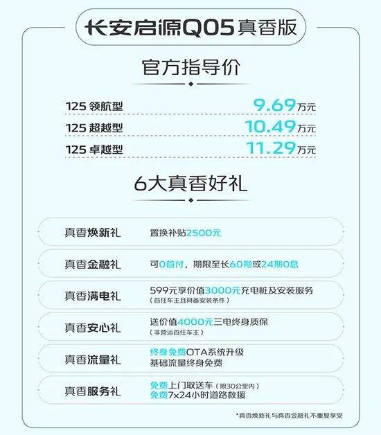 4月12日,长安启源Q05真香版正式上市,共推出3款车型,售价区间为9.69-11.29万元。新车定位紧凑型SUV,搭载数智AI电驱2.0动力系统,同时支持插混和增程两种动力驱动形式。此外,官方还推出了多项“真香”系列购车权益,包括真香焕新礼、真香金融礼、真香满电礼、真香安心礼、真香流量礼、真香服务礼等。