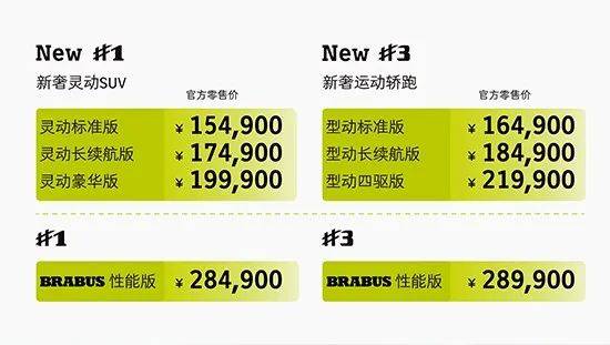 4月14日,smart品牌官方宣布,在国内市场焕新smart精灵#1及#3产品系列。其中,“新奢灵动SUV”smart精灵#1焕新推出灵动标准版、灵动长续航版、灵动豪华版,官方零售价分别为15.49万元、17.49万元、19.99万元,BRABUS性能版售价28.49万元;“新奢运动轿跑”smart精灵#3焕新推出型动标准版、型动长续航版、型动四驱版,官方零售价分别为16.49万元、18.49万元、21.99万元,BRABUS性能版售价28.99万元。