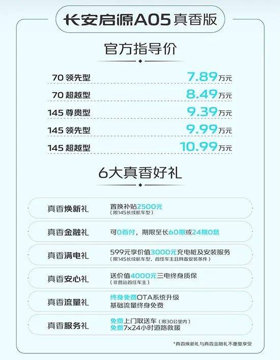 4月12日,长安启源A05真香版正式上市,共推出5款车型,售价区间为7.89-10.99万元。新车定位紧凑型车,搭载数智AI电驱2.0动力系统,可以同时支持插混和增程两种动力驱动形式。此外,官方还推出了多项“真香”系列购车权益,包括真香焕新礼、真香金融礼、真香满电礼、真香安心礼、真香流量礼、真香服务礼等。