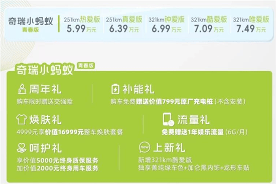 4月8日,奇瑞新能源旗下QQ冰淇淋青春版、小蚂蚁青春版正式上市。其中QQ冰淇淋青春版推出4款车型,售价区间2.99-4.39万元;小蚂蚁青春版推出5款车型,售价区间5.99-7.49万元。