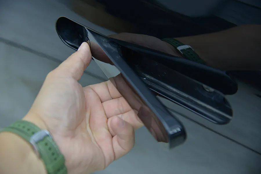 这辆车也是采用隐藏式门把手,不过没有电动弹起,需要徒手按压,和特斯拉有些相似。