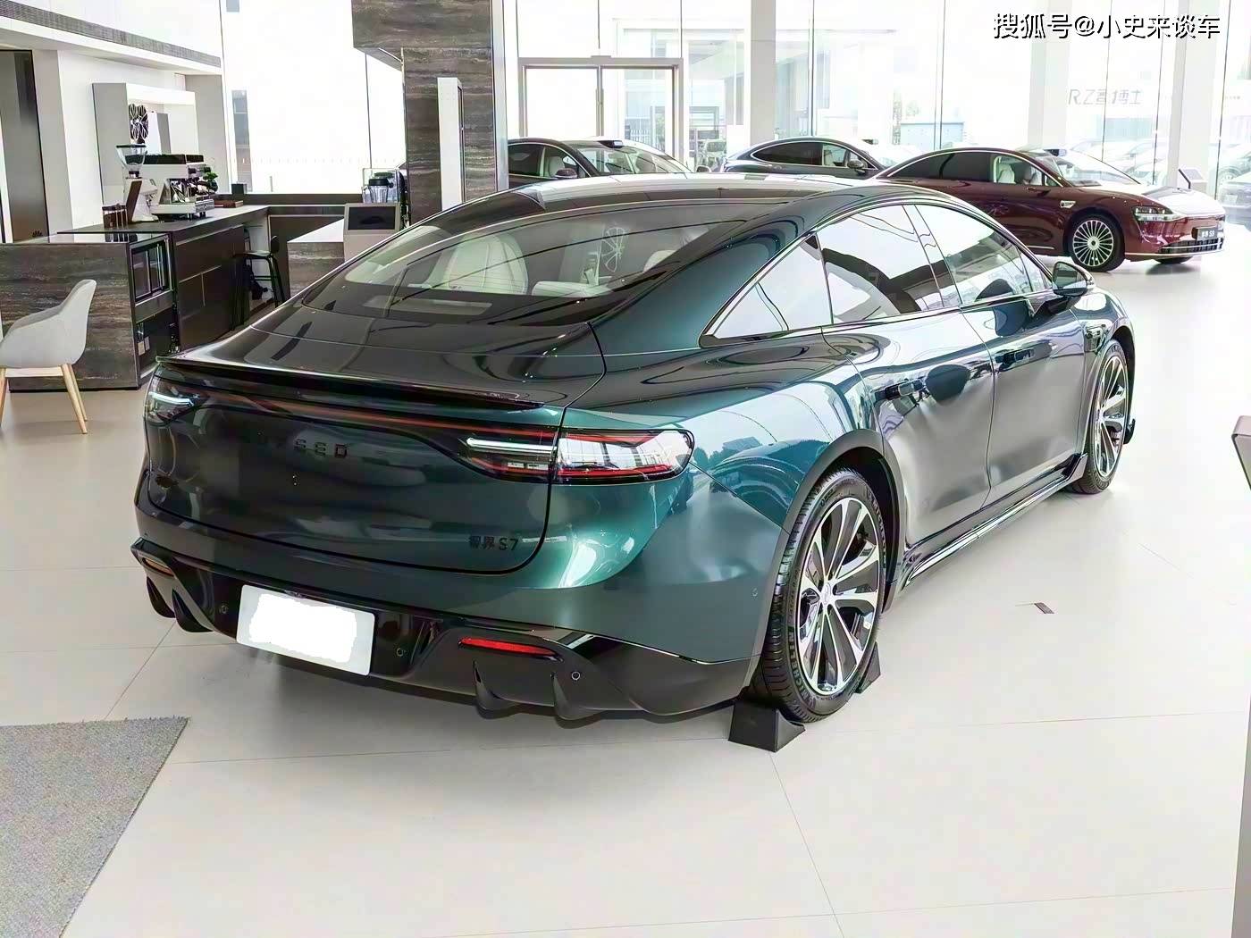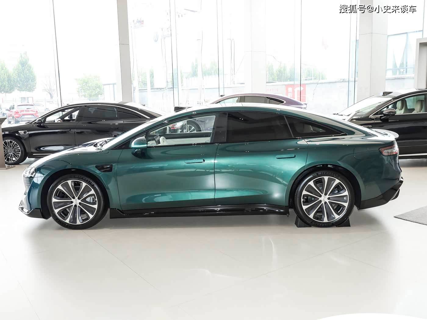 再来看车身侧面部分,车身侧面线条流畅舒展,溜背式轿跑造型凸显运动性能。无框车门与隐藏式门把手设计优化风阻表现,标准19英寸双五辐星芒轮毂提供霸气视觉效果,同时可选装20英寸低风阻轮毂以满足个性化需求。车身尺寸为4971mm(长)×1963mm(宽)×1474mm(高),轴距达到2950mm,确保车内宽敞的乘坐空间。隐藏式门把手不仅美观,还能降低行驶时的风阻系数,提升续航能力。车身轮廓修长,侧面线条从车头延伸至车尾,营造出中大型轿车的优雅气质。这种设计在提升视觉冲击力的同时,也优化了空气动力学性能,使车辆在高速行驶时更加稳定。