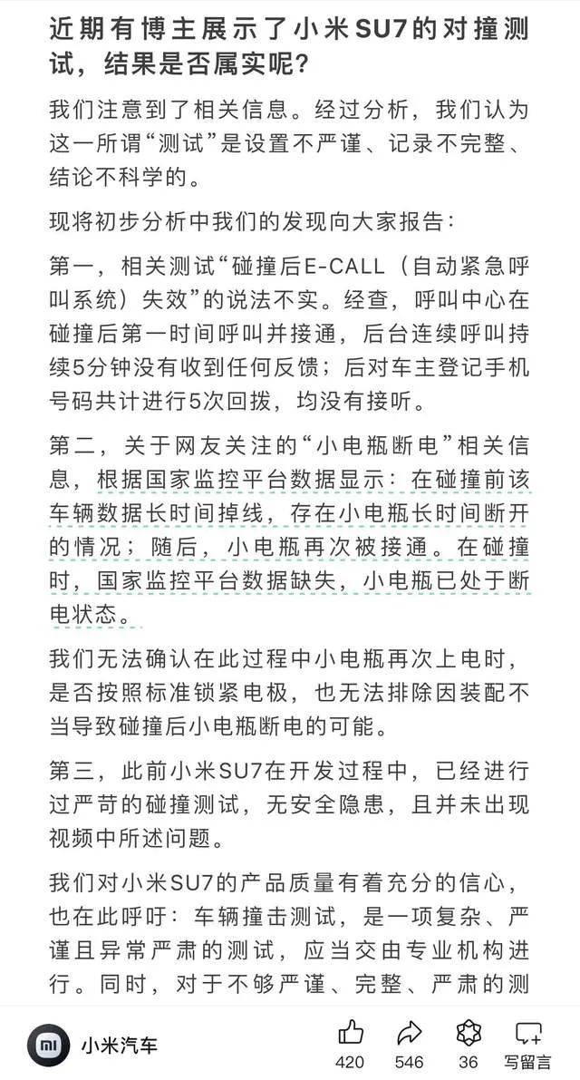 对此,小米汽车回应称,该测试存在设置不严谨、记录不完整、结论不科学的问题。