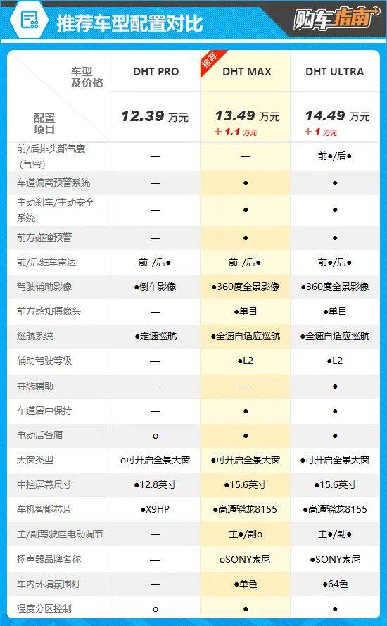 DHT ULTRA为顶配版车型,相较推荐车型贵了1万元,配置提升主要是增加了前/后排头部气囊(气帘)、前驻车雷达以及并线辅助等。虽然也都是些比较实用的功能,但结合1万元的差价来看,就显得不那么值得了,性价比偏低。