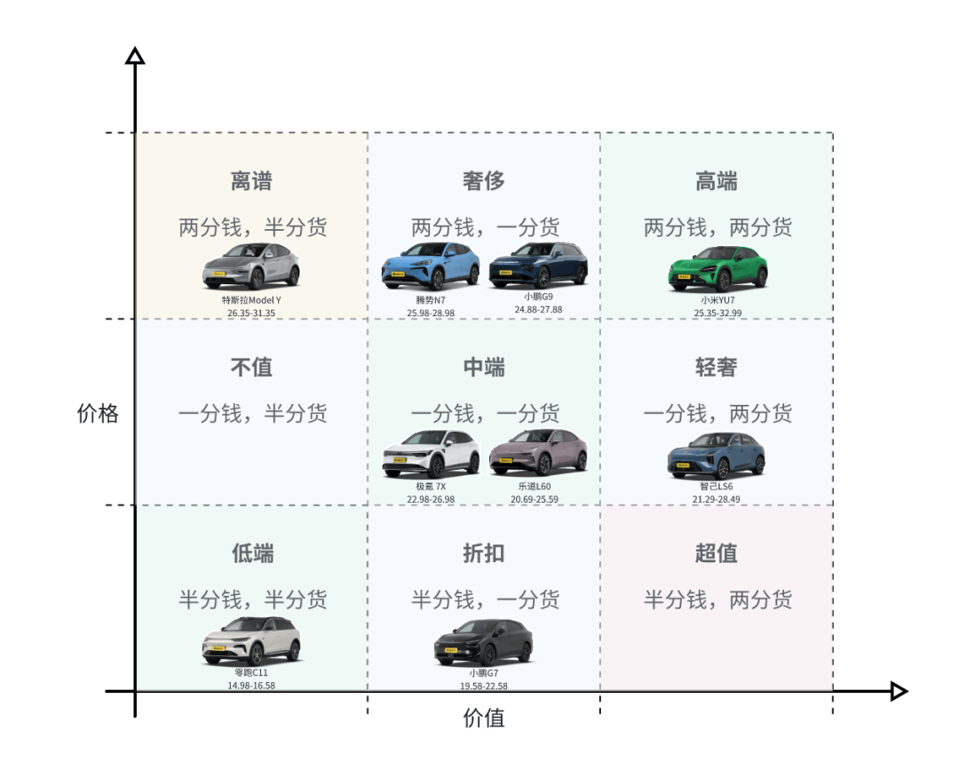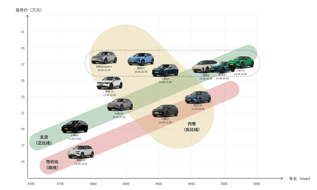 小米YU7一方面在合理的主流正比线上,另一方面其核心策略是在横向上与Model Y发生竞争关系,即更大的空间,更好的配置,但价格相近来实现竞争关系的匹配。在小米YU7的纬线上除了Model Y还有理想和智界等产品的存在。不过最终的结果来看,位于尺寸天平两端的Model Y和YU7成为了市场的赢家。