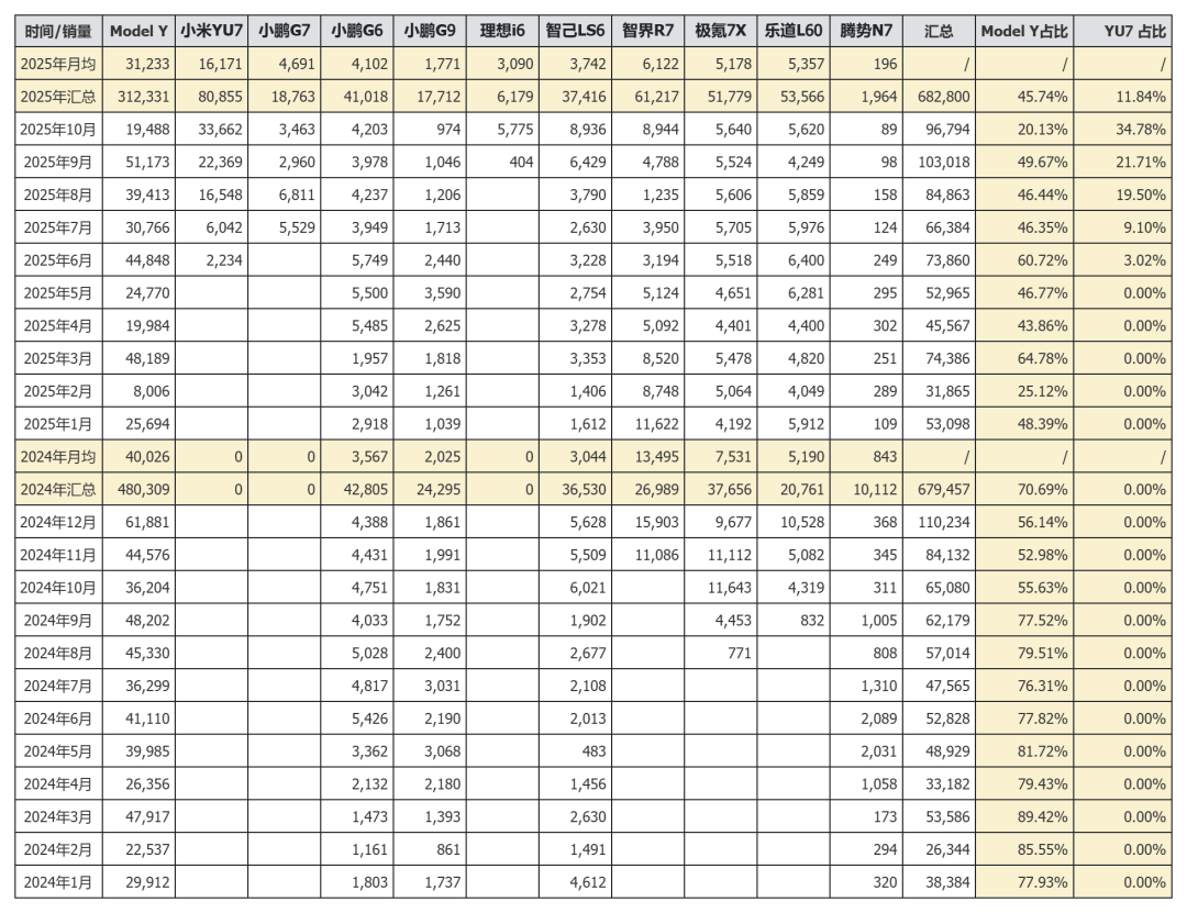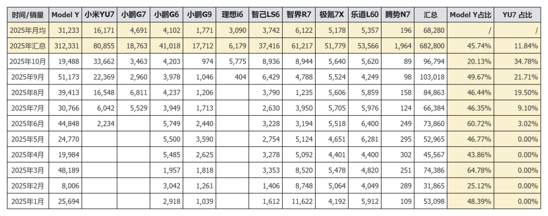 虽然热度不能完全预示一个产品上市后的销售成绩,但本质上还是有着一定的相关关系。截取2025年前十个月的销量,我们挑选了这个市场中的11款核心产品,单从销量上来看,在YU7上市之后,的确给Model Y带来了实质性的冲击,在这11款产品的总量占比上,此前Model Y会在50%上下波动。YU7的到来,慢慢的抢占了这个细分领域近三分之一的份额,而且随着时间的推进还会继续的提升。可以说Model Y遇到了真正的对手。