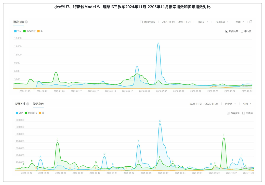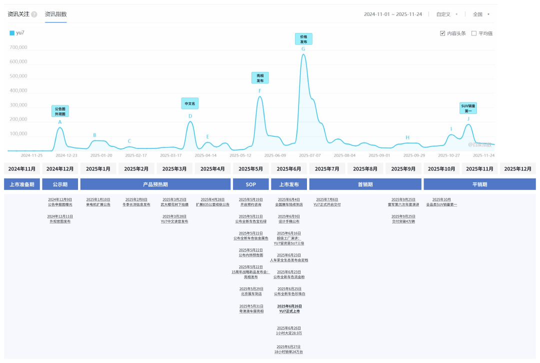 如果我们结合YU7关键词的资讯指数来看,其上市节奏中每个高点都贴合着每一个关键动作。A高点是公示和亮相快速拉升关注度;D高点则意味着预热的正式开始,公布了YU7的中文读法;F高点为亮相发布;G高点借助价格发布理所当然的冲上了产品生命周期的最高值;随后开始关注度不断回落。