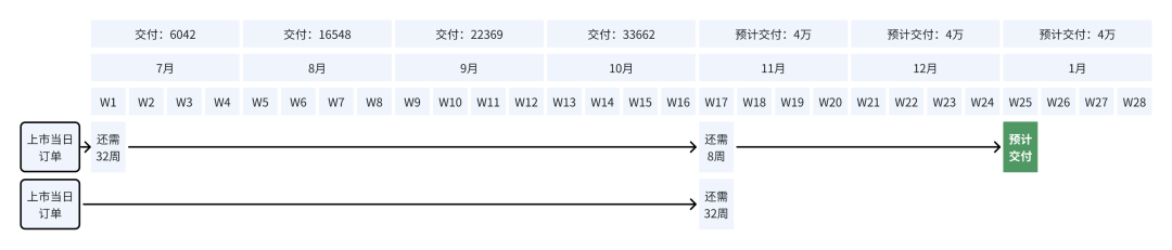在调研了几个上市当日的订单后发现,上市当天3-5分钟下单的用户,当时显示的交付周期为32周,到11月初现实的交付周期为8周,总体上交付周期提升了4周。到1月交付时,按照11月、12月分别交付4万来计算,总体交付在16万辆。另外如今小米APP现实,11月初下定还需要30周左右,接近8个月,与前文推测的10个月相差不多。