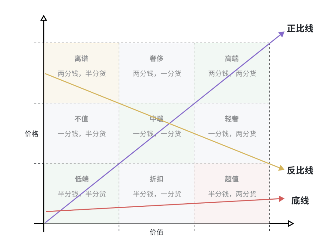 此前在关于市场分析的方法中,提出了三条关键线的分析逻辑:正比线是一个细分市场中正常的价值、价格的相关关系;底线则是性价比产品聚集的区域;反比线则是后来者不断挑战行业领导者所留下的一条线。