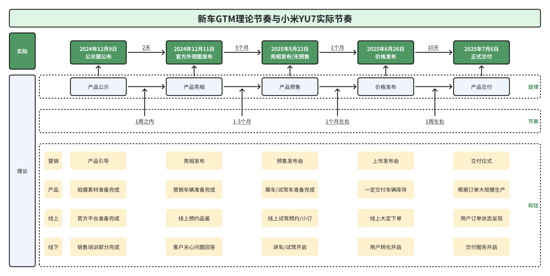 在一个新品上市的过程中,可以分出“旋律、节奏与和弦”,旋律就是核心要做的关键动作,节奏就是这些关键动作的时间线,而和弦就是在每个关键动作期间所需要联动的各个业务模块动作。在一辆新车的理论GTM节奏中,产品公示、产品亮相、产品预售、价格发布、产品交付是核心的旋律。小米YU7在理论之上实际的操作节奏如下。