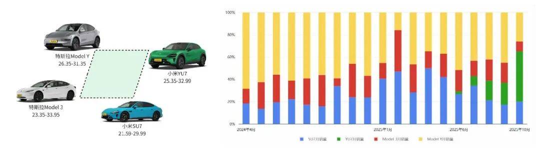 回到SU7和YU7自身关系,可以看到随着事件的发展,YU7快速占据了曾经SU7的位置,在9月厂商自身的占比中就超过了SU7并在10月拉升到了70%的占比,小米汽车的月销量也逼近了五万台。
