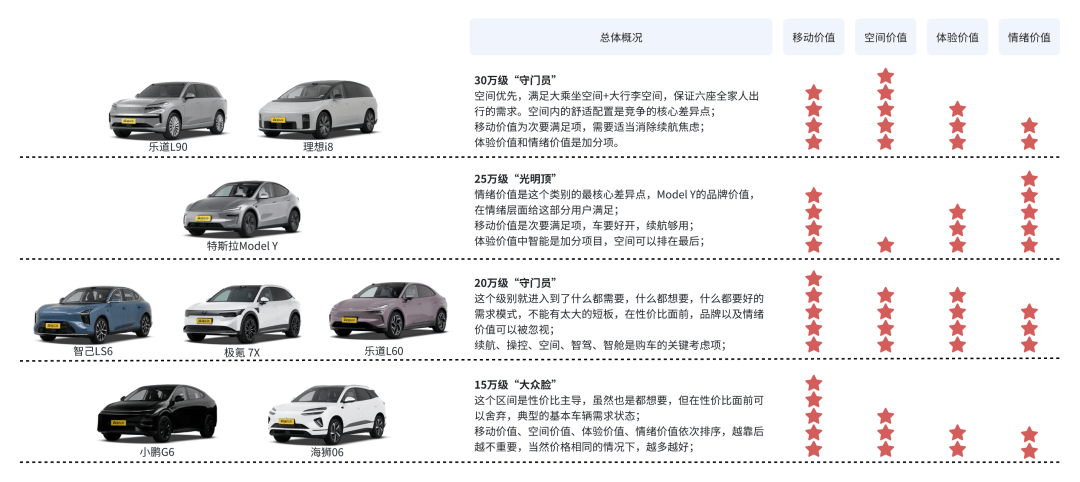 在小米YU7加入战场之前,15-30万级别的纯电SUV市场大致可以分为几个档次:15万级“大众脸”产品,这个级别要求产品什么都有,性价比要很高,比如比亚迪的海狮06和小鹏G6;20万级“守门员”产品,它们有点像一个“复仇者联盟”,曾经都抱有将Model Y拉下马的决心,但最终饮恨成为20万上下的门槛型产品,它们已经能做到25万级别的配置,但只能卖20万的价格,包括极氪7X、乐道L60以及智己LS6等;25万级“光明顶”,唯一绝对的王者就是Model Y,虽然产品总是被诟病诚意不足,但其强大的品牌号召力依然使其维持着销量冠军的地位;最后在30万级别,在YU7上市之后也出现了两个“守门员”级别的大六座产品,它们把五座SUV彻底框定在30万以内。