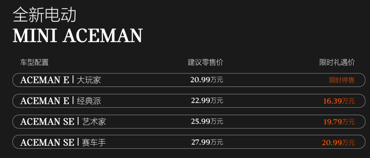 电动MINI COOPER和ACEMAN调整后的起售价分别为14.88万元和16.39万元,放眼15万-20万级市场,目前涌起的大部分电动产品更多倾向空间和智能化的打造,追求更大的空间和更智能的体验,于是在个性和乐趣的赛道上鲜有。