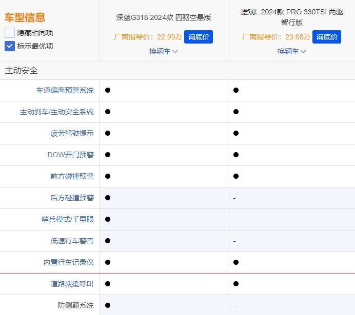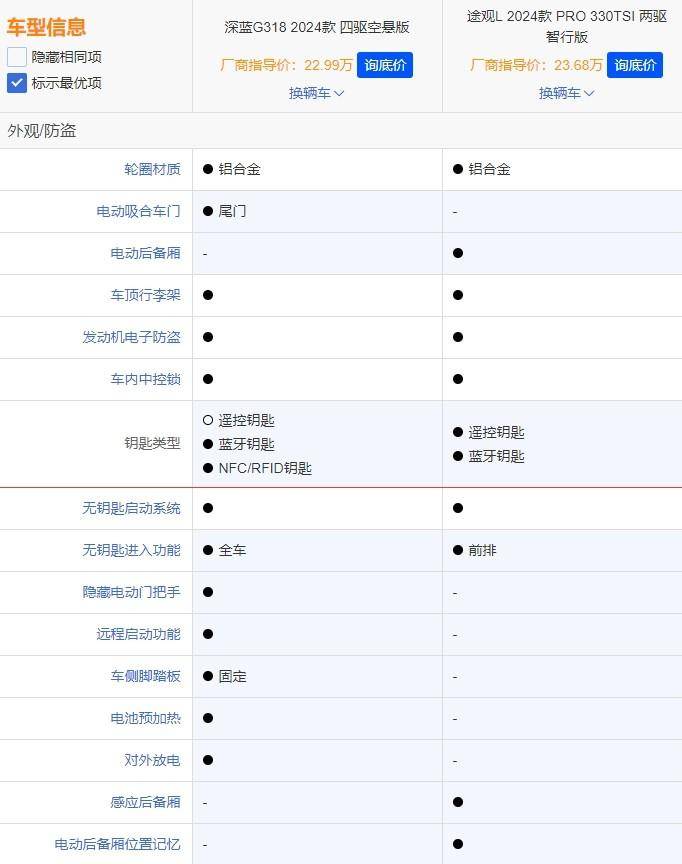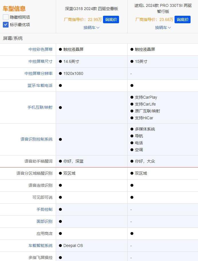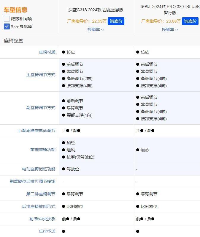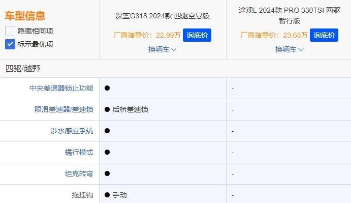 在配置方面,我们选取了两车价格差异最小的途观L 2024款 PRO 330TSI 两驱智行版(指导价23.68万)和深蓝G318 2024款 四驱空悬版(指导价:22.99万)进行对比,看看哪款配置更具诚意。