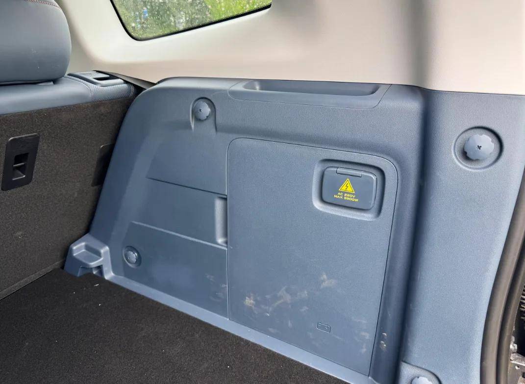 另外,后备箱两侧都还有丰富的挂钩,以及220V电源,最大可以支持3.3kW的放电。另外通过充电接口,还能实现6.6kW的外放电,野外吃个火锅、烧烤都不成问题。