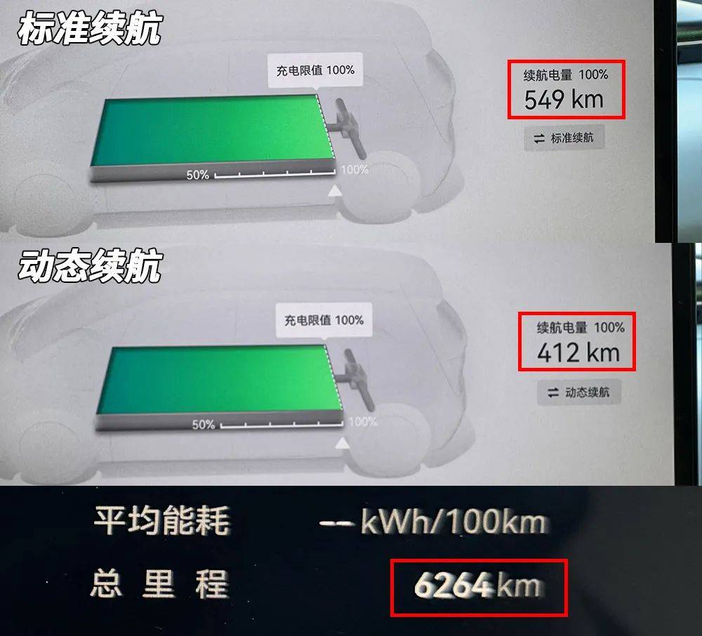 这辆车搭载了一块102千瓦时的三元锂电池,电芯来自宁德时代,CLTC标称续航里程702公里。在北京平均零上10度左右的气温环境下测试,充电至100%,标准模式显示续航里程为549公里,动态续航为412公里;当行驶到电量剩余3%时,标准模式显示可续航里程18公里,动态续航里程15公里。标准模式表显消耗里程531公里,动态模式表显消耗里程397公里,实际行驶里程317公里。计算得出标准模式的表显准确率为59.70%,动态模式准确率为79.85%。