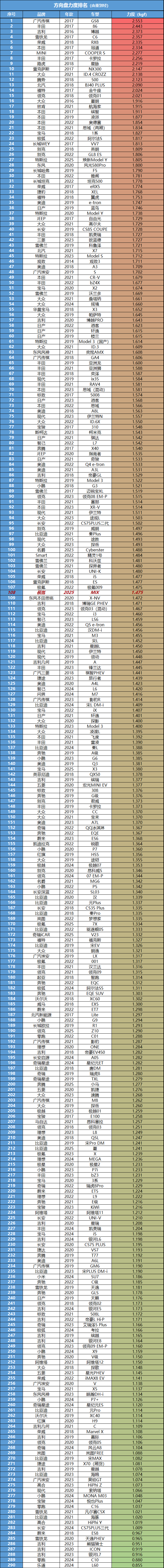 我们在同一路段(地面摩擦力相同),胎压调至厂家标准胎压,使用标准模式,用拉力计原地匀速旋转方向盘90度,取最大数值。
