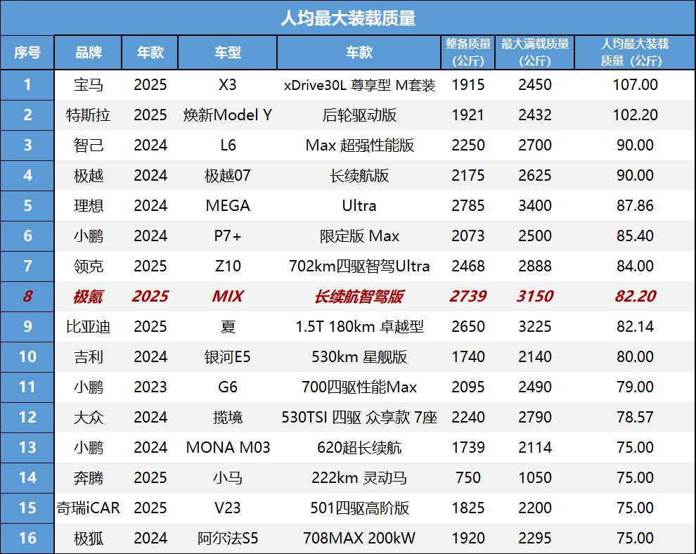 我们这辆车的整备质量为2739千克,最大满载质量为3150千克,计算得出这辆极氪2025款长续航智驾版的人均最大装载质量为82.20千克,比名义标准多出7.2千克。