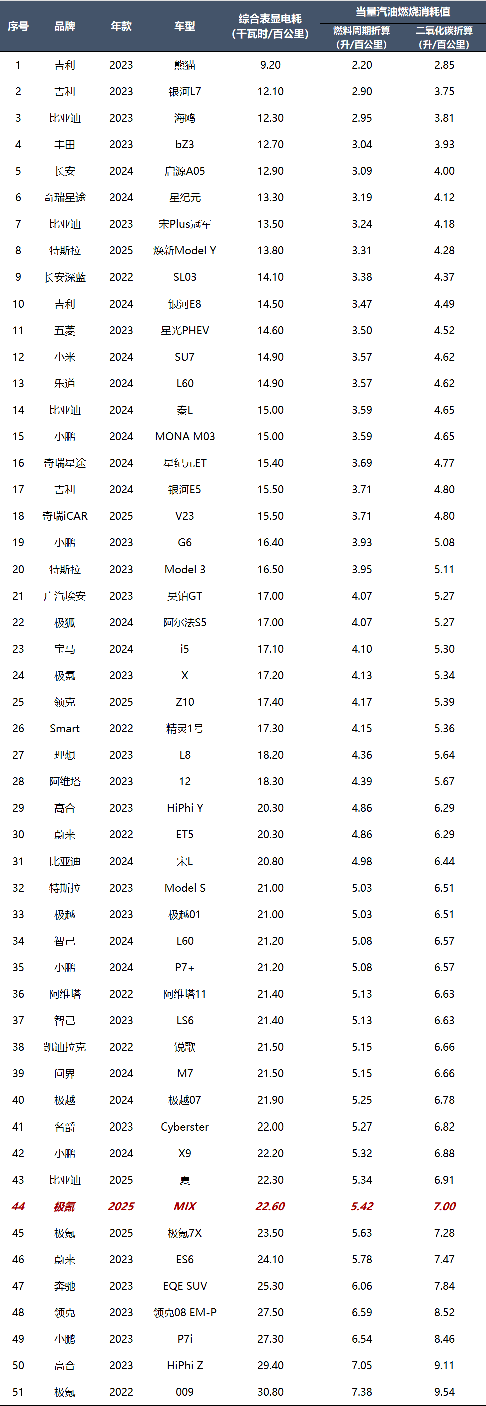 我们根据百公里耗电情况,进行电能当量燃油消耗折算,换算为“百公里油耗”。计算公式根据中华人民共和国标准《GB/T 37340-2019 电动汽车能耗折算方法》提供的“燃料生命周期法”和“二氧化碳排放法”分别进行计算。