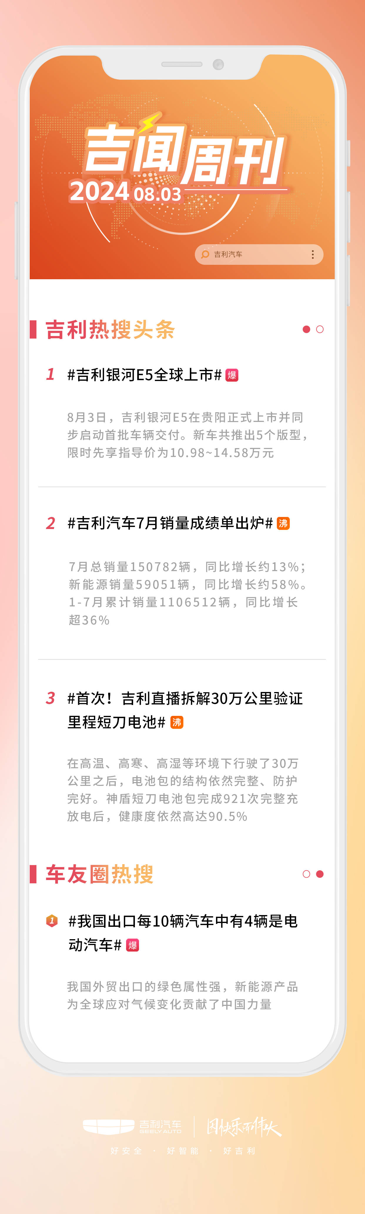 #吉闻周刊# 本周小吉热搜榜来了!吉利银河E5全球上市、吉利汽车7月销量成绩单出炉、吉利直播拆解30万公里验证里程短刀电池,还有各种车友们关心的热门话题~关注@吉利汽车 ,车讯头条抢先知!