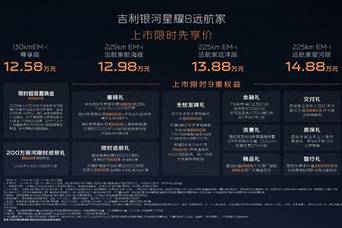 10月30日,吉利旗下的全新插电混动轿车银河星耀6正式上市,新车的售价区间为7.48-10.58万元,上市限时指导价为6.88-9.98万元。