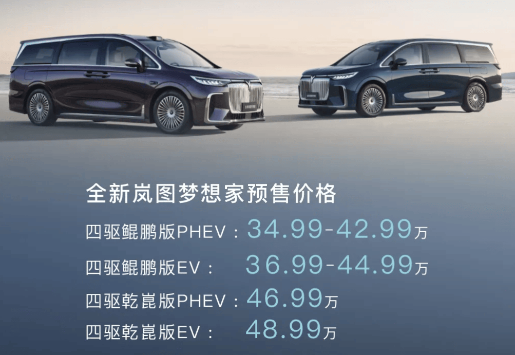 首先是在车展正式启幕前先声夺人开启预售的全新岚图梦想家。这款车定位“全景豪华科技旗舰MPV”,共提供两个版型,其中的鲲鹏版预售价34.99万元起,搭载华为乾崑智驾ADS 3.0及鸿蒙座舱的乾崑版预售价46.99万元起。