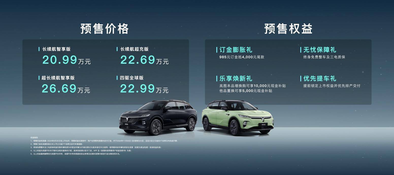 高端纯电SUV岚图知音紧随其后,于8月30日在2024成都车展上正式发布并开启预售。这款车共公布4个版本,预售价格区间为20.99-26.69万元,定位纯电家用SUV,向着Model Y、问界M5等对手迎头而上,切入更加主流的市场。