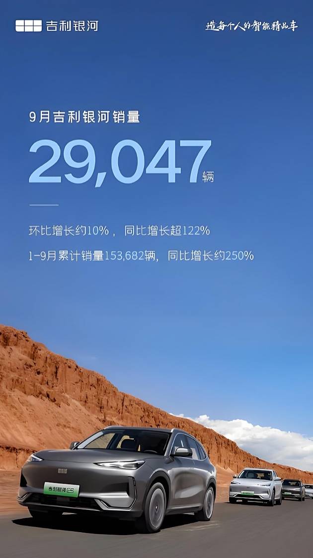 国庆假期第一天,吉利汽车集团发布了9月销量数据,9月销量突破20万辆,新能源销量、海外出口销量持续大幅增长,增速迅猛。其中,吉利银河表现尤为亮眼,9月销量29047辆,同比增长约122%,1-9月累计销量153682辆,同比大增250%。