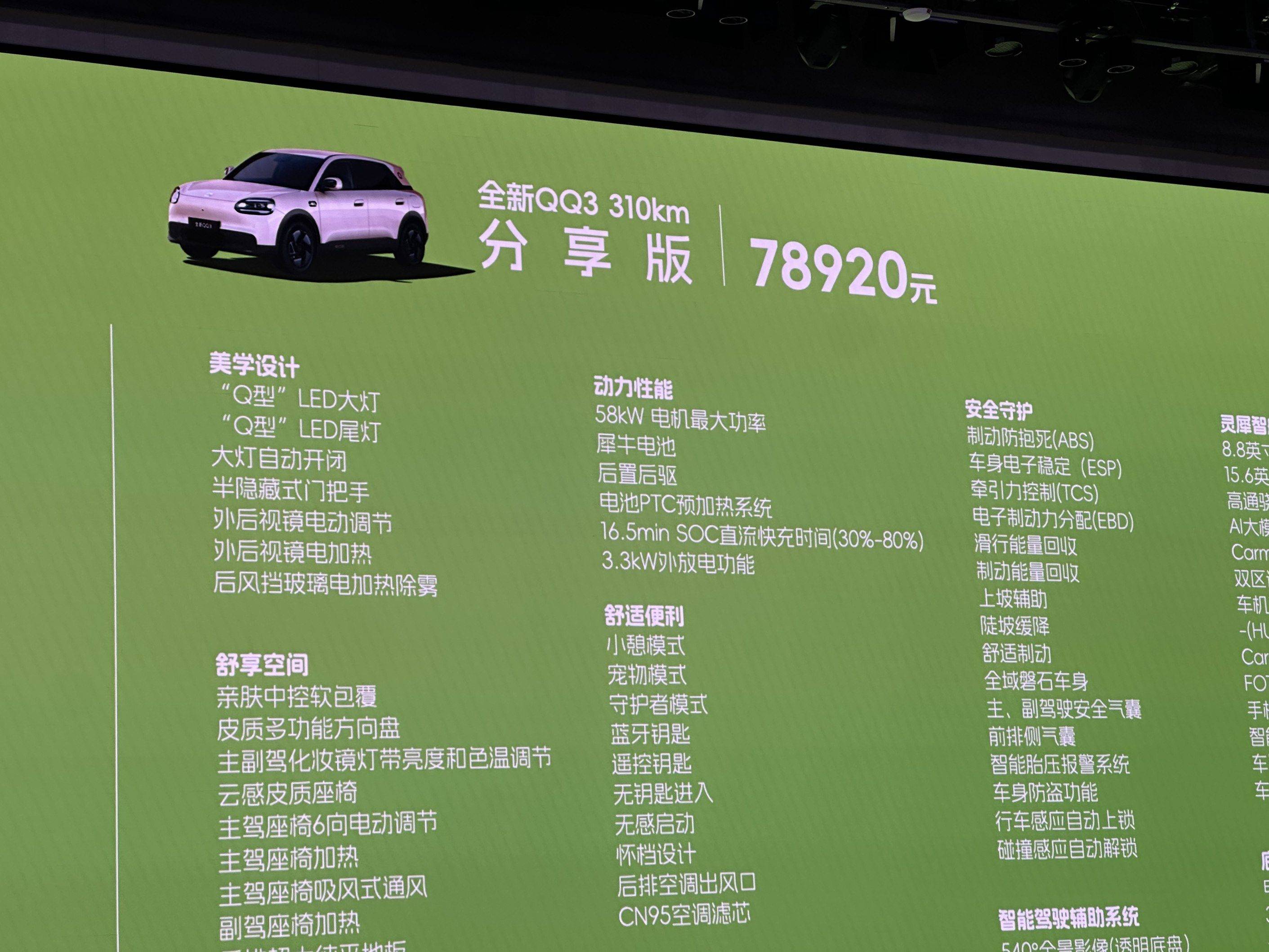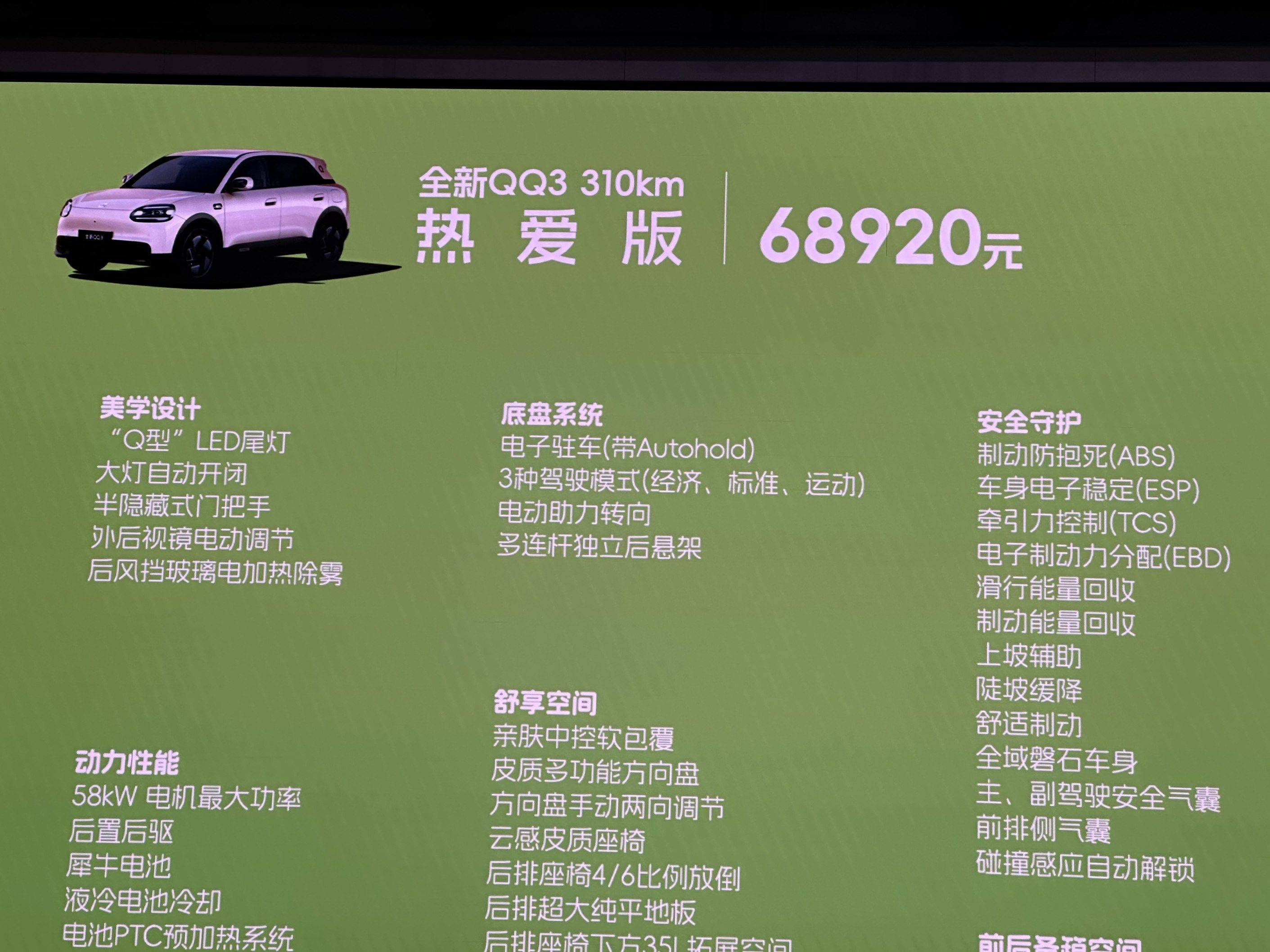 在这个万物生长的春天,全新QQ3预售正式开启。它不仅是一辆纯电小车,更是懂你的快乐搭子,是装得下所有向往的空间,是让每一段旅程都值得期待的伙伴。