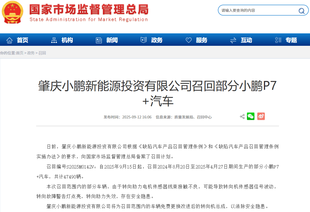 9月12日,据国家市场监管总局网站信息,日前,肇庆小鹏新能源投资有限公司根据《缺陷汽车产品召回管理条例》和《缺陷汽车产品召回管理条例实施办法》的要求,主动向国家市场监督管理总局备案了召回计划。自9月15日起,召回2024年8月20日至2025年4月27日期间生产的部分小鹏P7+汽车,共计47490辆。