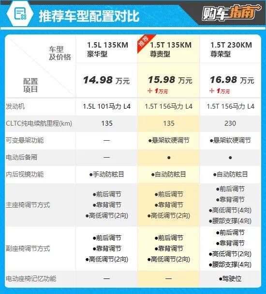 综合来看,推荐车型相比入门版贵出1万元,但升级显著。发动机从1.5L自然吸气升级为1.5T涡轮增压,动力表现大幅提升;同时增加了悬架软硬调节功能,并将内后视镜升级为自动防眩目。这1万元花费带来了驾驶质感和安全性的双重飞跃,性价比极高。