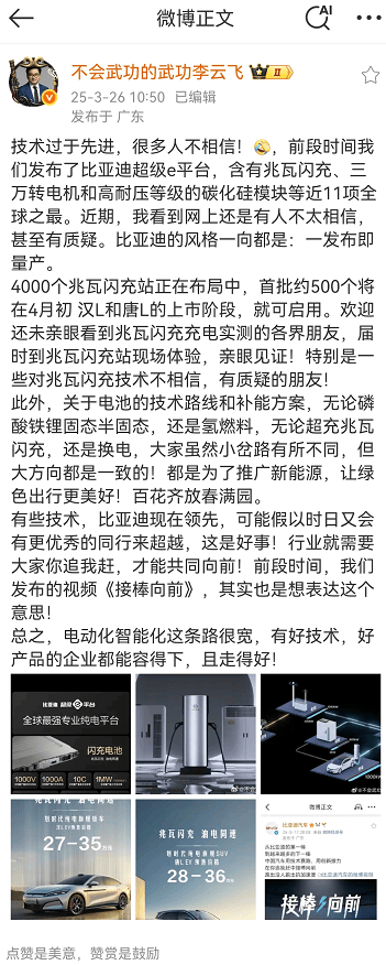 在新能源领域,比亚迪的技术创新一直处于行业前沿。近期,李云飞总经理通过微博宣布,比亚迪将于2025年4月初启动首批约500座兆瓦级闪充站,并与全新车型同步落地。无论是技术路线的多元化,还是绿色出行的推广,腾势N9与比亚迪的创新技术紧密结合,为消费者提供了更加便捷的充电体验,也为新能源车的发展注入了新的动力。