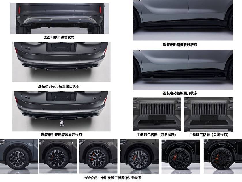 车尾采用贯穿式尾灯设计,下沿线条为分段式造型,与9X形成区分。车身尺寸方面,极氪8X长宽高为5100/1998/1780毫米,轴距3069毫米,整体略小于9X,但仍处于大型SUV主流尺寸区间。申报信息显示,新车提供黑化风格外观套件,并可选电动侧踏和电动牵引装置,具备2000公斤牵引资质。