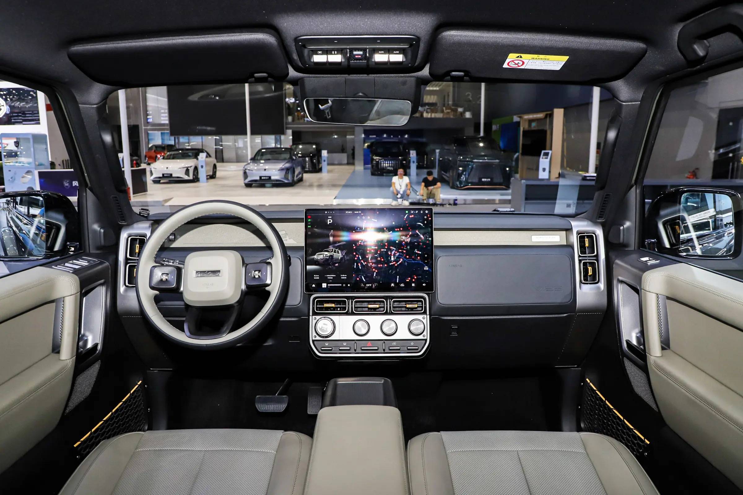 车内部分,iCAR V23的仪表台、门板运用大量直线条勾勒出棱角感,营造出硬派的氛围。在此基础上,iCAR V23提供双色材质包覆的圆形多功能方向盘和电子怀挡,15.4英寸中控屏采用悬浮式布局,智能座舱系统匹配高通骁龙8155芯片,支持5G网络、无线CarPlay等功能。