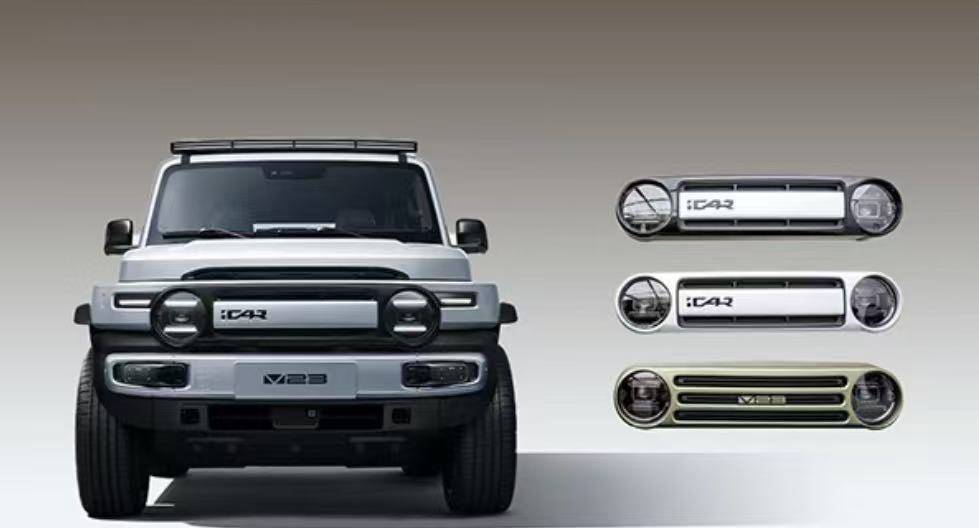 iCAR V23采用“方盒子”造型轮廓,配搭凸出的前/后保险杠、外扩式轮拱等设计元素,给人一种硬派SUV的形象特征。而在前脸部分,iCAR V23融合了复古圆形大灯组及横辐式日间行车灯,支持适配三种不同风格格栅,包括两种带“iCAR”字标的封闭式格栅以及一种带“V23”字标的三孔式格栅。
