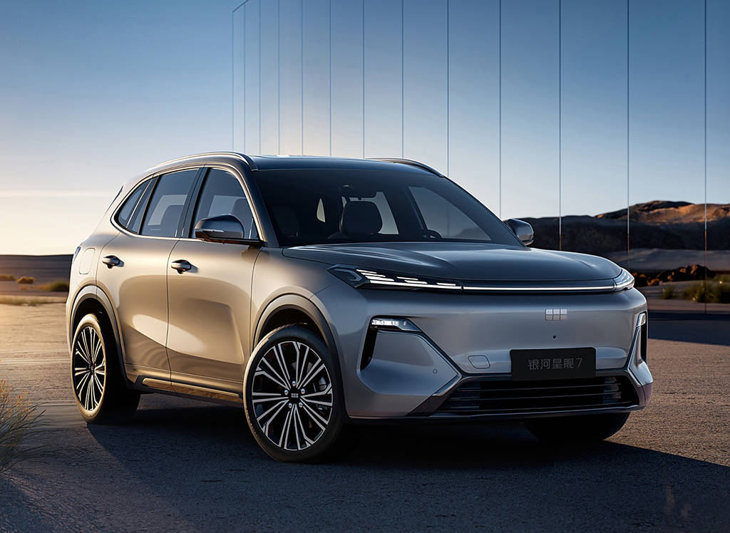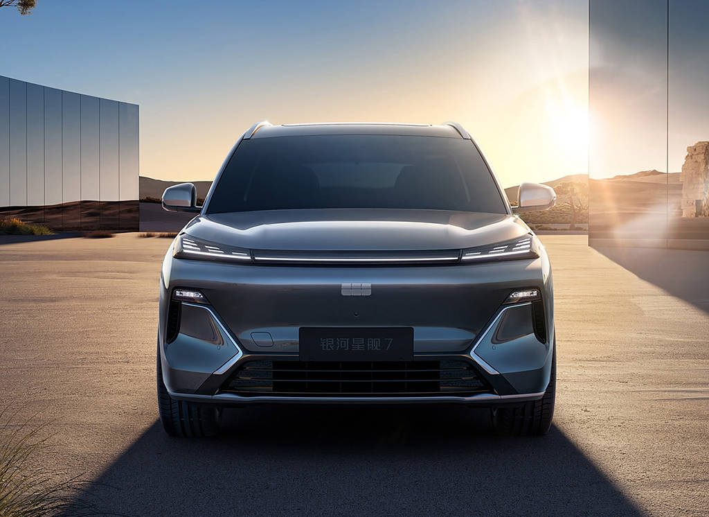 银河星舰7的外观设计极具未来感,采用了吉利银河家族最新的设计语言。前脸部分,封闭式格栅搭配贯穿式灯带,不仅彰显了新能源车的身份,更营造出强烈的视觉冲击力。车身侧面线条流畅,隐藏式门把手和车顶行李架的设计既美观又实用。车尾部分,“旭日东升”贯穿式尾灯在夜晚点亮时,如同璀璨的星河,极具辨识度。