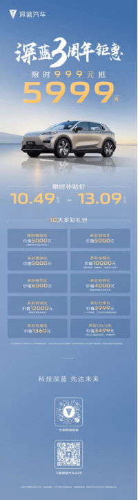如今新能源市场竞争激烈,内卷之下价格倒置而配置拉满。深蓝S05在保持10-15万低价区间同时,稳守安全配备业界一梯队宁德时代电芯,兼顾全民辅助驾驶功能平权、大空间、智能感观交互,敢于与业界纯电大热友商车一较高下,更于近日加入品牌3周年限时优惠活动。该活动共有5重好礼包含直接购车优惠、膨胀金、置换礼、免息金融礼和多项用车礼遇。造车品质保障肯下本还不定期推出各项优惠活动,这或许才是真正意义上的由内而外的平权,也更有信心迎接诸如零跑B10这些后起之秀挑战,只有勇于直面市场才能更长远的看到远方。
