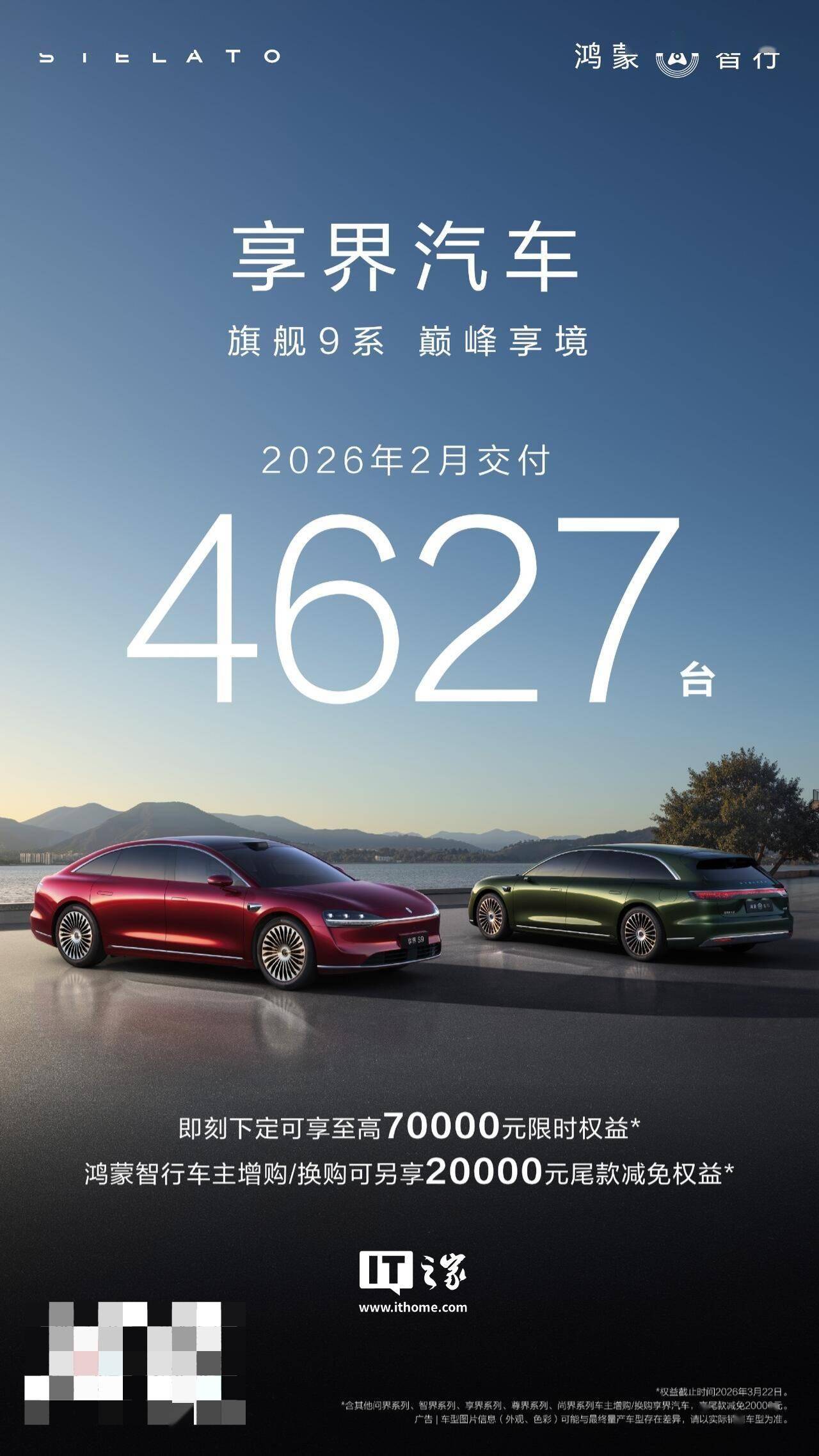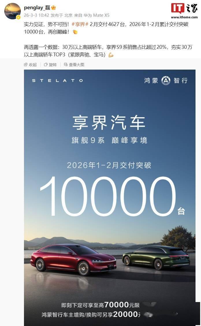 IT之家 3 月 3 日消息,鸿蒙智行官方今日公布了享界汽车的 2 月交付数据:交付 4,627 台,2026 年 1-2 月累计交付突破 10,000 台,宣称“再创巅峰”。
