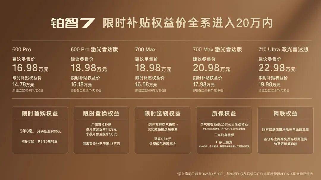 3月29日,广汽丰田铂智7正式登上台前,5米1车长的D级纯电轿车,鸿蒙座舱、激光雷达智驾、双腔空气悬架,这些东西出现在20万以内的价格表上。