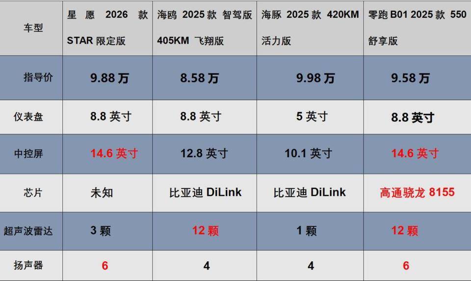 虽然说零跑B01的定位更高一些,但是目前零跑家族在年底可是拿出了众多优惠政策,其中除了现金补贴、金融补贴、换购补贴等等,整车的裸车价格来到了8万多点,整体而言价格上,也没有比吉利星愿、比亚迪海鸥、海豚等车型贵多少,那这四款车到底如何选,才不算踩坑呢?
