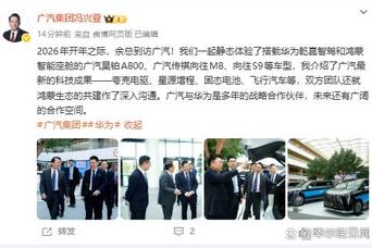 【华为余承东到访广汽,冯兴亚:未来还有广阔的合作空间】广汽集团董事长冯兴亚发微博表示,2026年开年之际,余总(余承东)到访广汽!我们一起静态体验了搭载华为乾崑智驾和鸿蒙智能座舱的广汽昊铂A800、广汽传祺向往M8、向往S9等车型,我介绍了广汽最新的科技成果——夸克电驱、星源增程、固态电池...